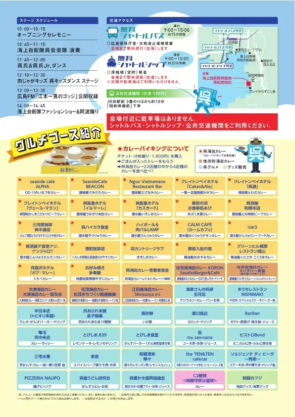内容 | (1) 呉海自カレーバイキング(呉海自カレー食べ比べ)(2) 呉グルメ・物産販売(市内飲食店をはじめとした50店舗が出店)(3) ステージイベント(4) 呉地方隊フリートフェスタ同時開催(艦艇一般公開等)(5) 海上保安庁巡視船一般公開 |