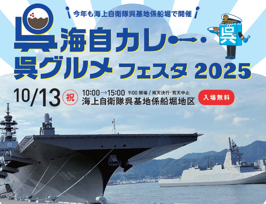 呉市内で提供されている「呉海自カレー」をテーマとしたイベント「呉海自カレー・呉グルメフェスタ2025」が、2025年10月13日(月・祝)に開催されますので、プレスリリースをご紹介いたします。