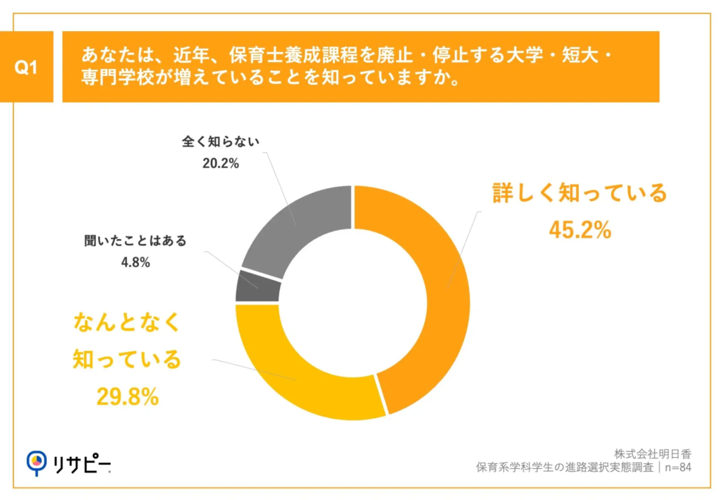 「Q1.あなたは、近年、保育士養成課程を廃止・停止する大学・短大・専門学校が増えていることを知っていますか。」(n=84)と質問したところ、「詳しく知っている」が45.2%、「なんとなく知っている」が29.8%という回答となりました。