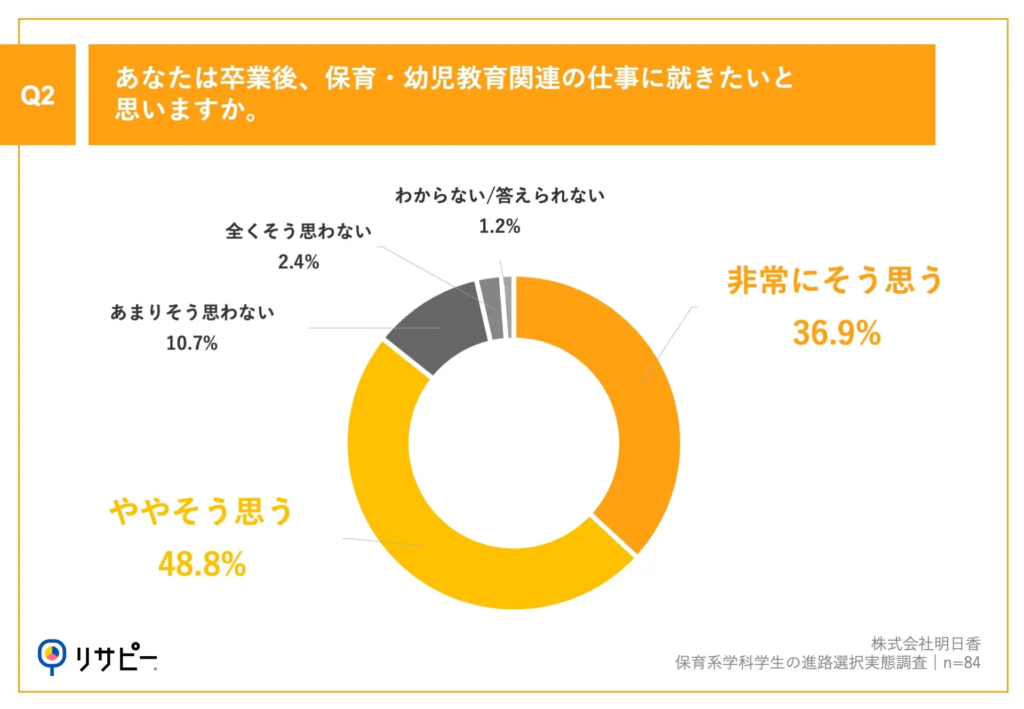 「Q2.あなたは卒業後、保育・幼児教育関連の仕事に就きたいと思いますか。」(n=84)と質問したところ、「非常にそう思う」が36.9%、「ややそう思う」が48.8%という回答となりました。