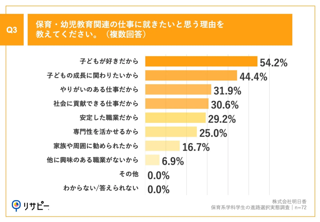 Q2で「非常にそう思う」「ややそう思う」と回答した方に、「Q3.保育・幼児教育関連の仕事に就きたいと思う理由を教えてください。(複数回答)」(n=72)と質問したところ、「子どもが好きだから」が54.2%、「子どもの成長に関わりたいから」が44.4%、「やりがいのある仕事だから」が31.9%という回答となりました。