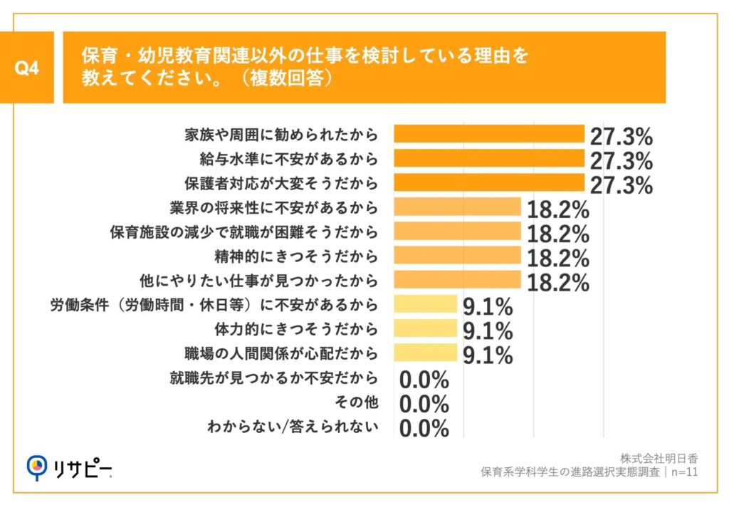 Q2で「あまりそう思わない」「全くそう思わない」と回答した方に、「Q4.保育・幼児教育関連以外の仕事を検討している理由を教えてください。(複数回答)」(n=11)と質問したところ、「家族や周囲に勧められたから」が27.3%、「給与水準に不安があるから」が27.3%、「保護者対応が大変そうだから」が27.3%という回答となりました。