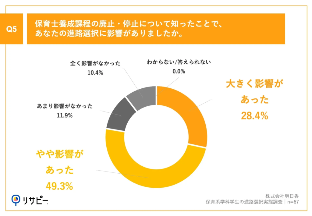 Q1で「詳しく知っている」「なんとなく知っている」「聞いたことはある」と回答した方に、「Q5.保育士養成課程の廃止・停止について知ったことで、あなたの進路選択に影響がありましたか。」(n=67)と質問したところ、「大きく影響があった」が28.4%、「やや影響があった」が49.3%という回答となりました。