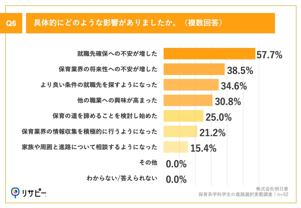 Q5で「大きく影響があった」「やや影響があった」と回答した方に、「Q6.具体的にどのような影響がありましたか。(複数回答)」(n=52)と質問したところ、「就職先確保への不安が増した」が57.7%、「保育業界の将来性への不安が増した」が38.5%、「より良い条件の就職先を探すようになった」が34.6%という回答となりました。
