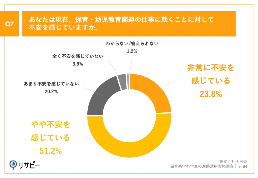 「Q7.あなたは現在、保育・幼児教育関連の仕事に就くことに対して不安を感じていますか。」(n=84)と質問したところ、「非常に不安を感じている」が23.8%、「やや不安を感じている」が51.2%という回答となりました。