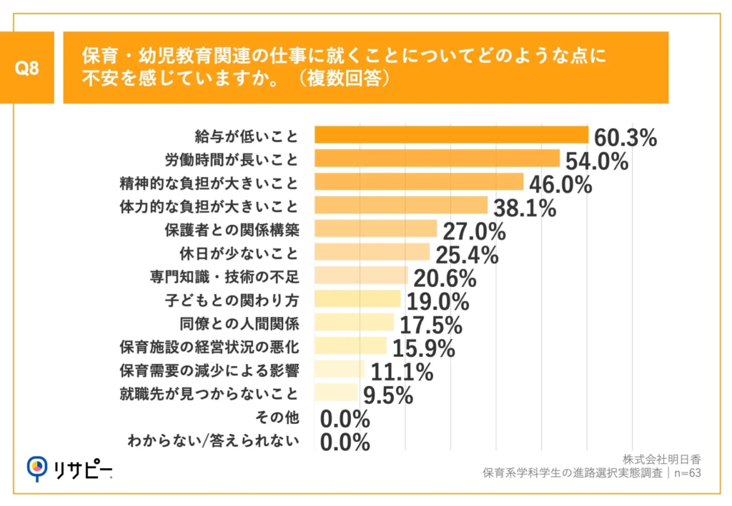 Q7で「非常に不安を感じている」「やや不安を感じている」と回答した方に、「Q8.保育・幼児教育関連の仕事に就くことについてどのような点に不安を感じていますか。(複数回答)」(n=63)と質問したところ、「給与が低いこと」が60.3%、「労働時間が長いこと」が54.0%、「精神的な負担が大きいこと」が46.0%という回答となりました。