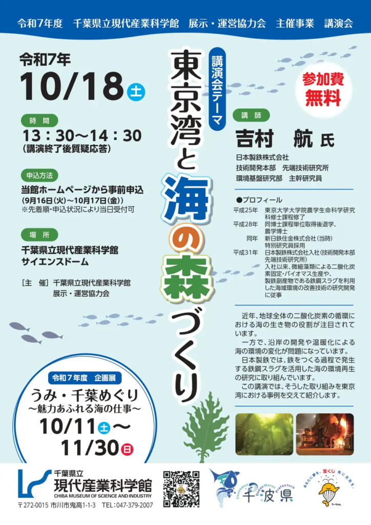 近年、地球全体の二酸化炭素の循環における海の生き物の役割が注目されています。一方で、沿岸の開発や温暖化による海の環境の変化が問題になっています。本講演会では鉄を作る過程で発生する物質を活用した、海の環境再生研究の最先端を紹介します。