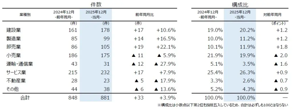 業種別にみると、7業種中4業種で前年を上回った。『サービス業』(前年同月215件→232件、7.9%増)が最も多く、12月としては2000年以降で最多となった。『建設業』(同161件→178件、10.6%増)、『小売業』(同186件→175件、5.9%減)が続いた。『卸売業』(同86件→105件、22.1%増)が最も増加し、5カ月ぶりに100件超となった。『不動産業』(同28件→23件、17.9%減)は、7カ月ぶりに前年を下回った。