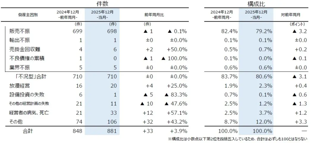 主因別にみると、「販売不振」が698件(前年同月699件、0.1%減)で最も多く、全体の79.2%(対前年同月3.2ポイント減)を占めた。「売掛金回収難」(前年同月4件→6件、50.0%増)や「業界不振」(同5件→5件)などを含めた『不況型倒産』(同710件→710件)は前年から横ばいで推移した。