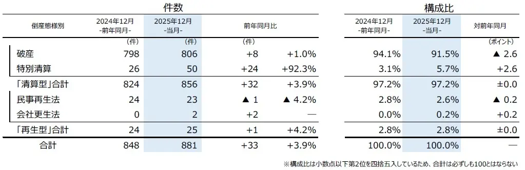 『清算型』では、「破産」が806件(前年同月798件、1.0%増)で最も多く、12月としては4年連続で増加した。「特別清算」は50件(同26件、92.3%増)と大幅に増加し、2000年以降で過去2番目に多かった。