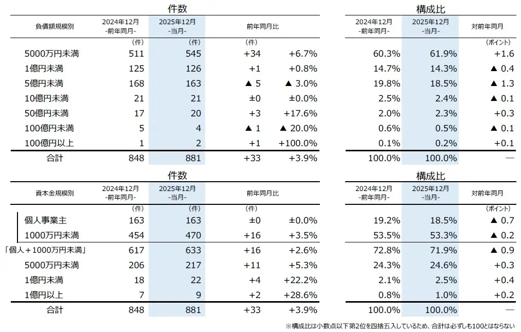 2025年は、2024年と同様に好調な業績を維持する上場・大手企業が目立ったほか、100億円を超える大型倒産は9件と低調に推移した。一方、中小企業に目を向けると、物価高や賃上げ、人手不足などの経営課題に打つ手がなく、事業継続を断念する小規模事業者が発生し続けた。負債額規模別では「5000万円未満」のみが前年から増加(7.8%増)し、負債の小規模化が一段と進んだ。