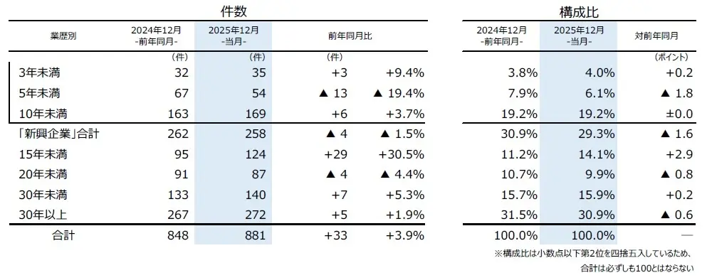業歴別にみると、「30年以上」が272件(前年同月267件、1.9%増)で最も多く、4カ月連続で前年を上回った。このうち、老舗企業(業歴100年以上)の倒産は8件(同8件)発生し、2025年で最も少なかった。