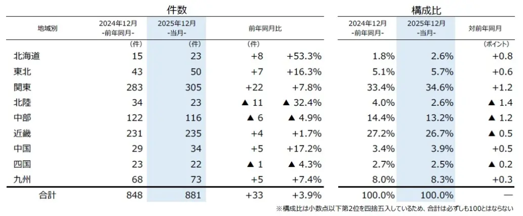地域別にみると、9地域中6地域で前年を上回った。最も件数が多かったのは、『関東』(前年同月283件→305件、7.8%増)で、7カ月連続で前年を上回った。特に「栃木」(同10件→19件)や「埼玉」(同23件→38件)の増加が件数を押し上げた。『近畿』(同231件→235件、1.7%増)は、12月としては4年連続で増加した。