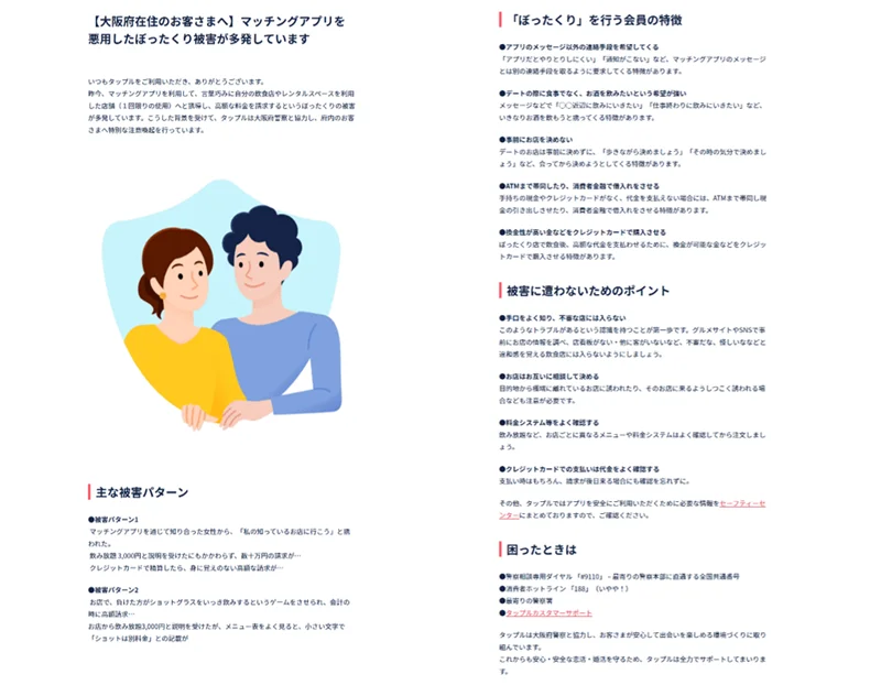 近年、マッチングアプリを利用して、言葉巧みに飲食店へと誘導し、高額な料金を請求するというトラブルが増加しております。こうした状況を受け、タップルは大阪府警察と連携して、アプリを通じた注意喚起施策を開始しました。府内の利用者に向けて啓発を行うことで、被害未然防止を目指します。