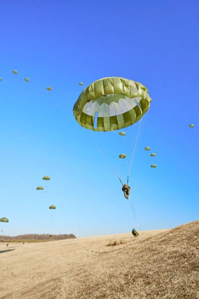 空挺団の隊員たちは見事な落下傘降下を披露した。落下傘降下は作戦成功のための手段の1つ。目標地域に次々と着地した隊員たちは続けて戦闘行動の準備を進めるのだ